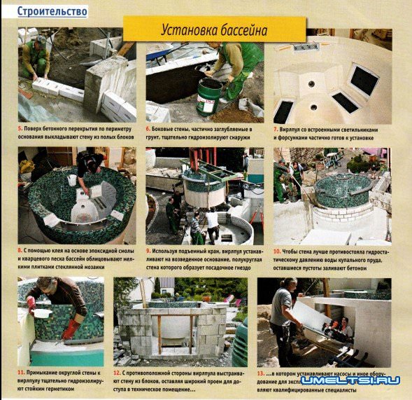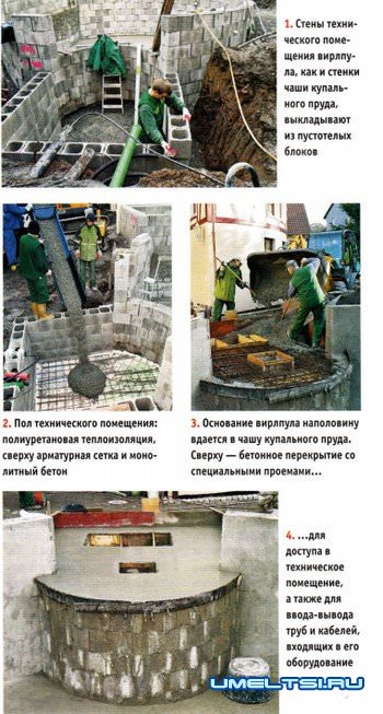 Изготовление и монтаж бассейна выполняли квалифицированные специалисты лицензированной фирмы. Их профессиональные советы были учтены и при строительстве капитального основания для вирлпула, на которое с помощью крана установили готовый басссейн. В специальном отсеке вспомогательного помещения, оснащенного дверцами и люком, смонтировали техническое оборудование для бассейна. Кроме принадлежностей для вирлпула здесь можно хранить и мелкий садовый инвентарь. Панель управления оборудованием, напротив, находится снаружи — на стене вспомогательного помещения.