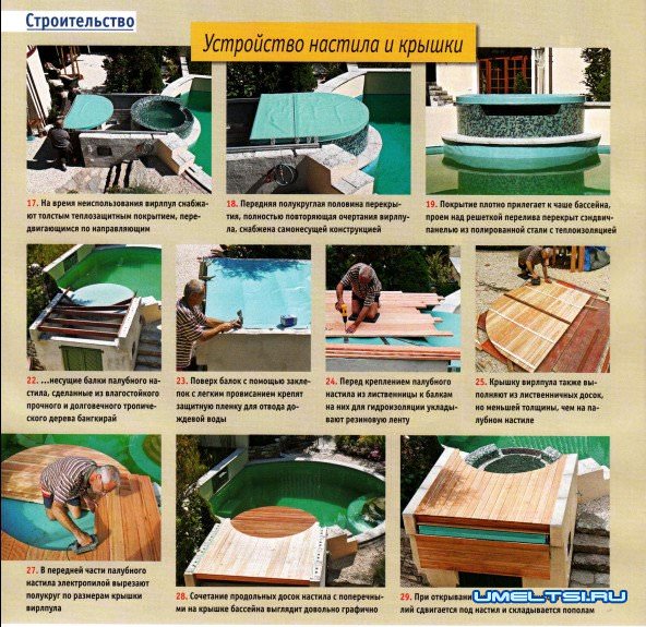 Данный термин, относящийся в строгом смысле к функциональному обозначению верхней пассажирской палубы круизных лайнеров, вполне передает и смысл устройства деревянного настила над техническим помещением вирлпула. Палуба-терраса из прочных толстых досок представляет собой естественный солярий, удобное место для приема солнечных ванн в непосредственной близости от воды, а также своеобразный пляжный лежак — в стационарном, а не мобильном варианте.