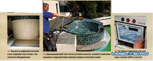 Оригинальная конструкция и эксклюзивный дизайн вирлпула делают его уникальным. Корпус бассейна с теплоизоляцией из пенополиуретана выполнен из прочного композитного пластика. Форма и размеры чаши, а также количество и расположение форсунок выбраны индивидуально. Для отделки вирлпула использована стеклянная мозаика сине-зелено-золотой гаммы, удачно гармонирующая как с дизайном купального пруда, так и с окружающей садовой растительностью. Благодаря системе электроподогрева и эффективной теплоизоляции как самой чаши, так и плотно закрывающегося покрытия в вирлпуле можно поддерживать температуру воды до 38° С. Изолирующее покрытие выполнено из той же пленки, что использовалась при облицовке чаши купального водоема, снабжено теплоизоляцией и отделано вагонкой из лиственницы. При пользовании бассейном защитное покрытие и деревянная откидная крышка легко сдвигаются по направляющим под палубу-террасу, предназначенную для приема солнечных ванн. Доски покрытия смонтированы перпендикулярно доскам палубного настила, а сама крышка расположена ниже палубы, что создает интересный визуальный эффект.