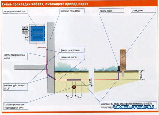 Конец кабеля, питающего привод, подсоединяют к предохранительному щиту. Прокладку кабеля через фундаментную стену, а также через перекрытие между подвалом и первым этажом, нужно выполнять в жестком защитном кожухе из стальной трубы. Кабель прокладывают в хозяйственное (техническое) помещение или в прихожую, где обычно на стене установлен предохранительный щит. Цепь, питающая привод ворот, должна быть защищена от тока перегрузки и короткого замыкания автоматическим выключателем на 10 А, а вся электрическая система дома - оснащена устройством защитного отключения (УЗО) на 30 мА.