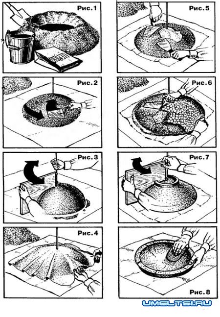 В середину горки (рис.2) втыкается или вбивается металлический прут, на который своими проволочными петлями надевается шаблон 1 (рис.9): вращением его (рис.3) формируется полусфера — форма внутренней части будущей вазы.