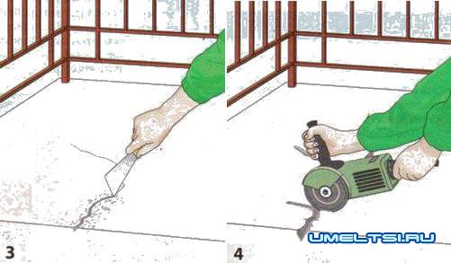 4.Трещины большего размера требуют укрепления. Для этого «болгаркой» выполняют поперечные борозды.