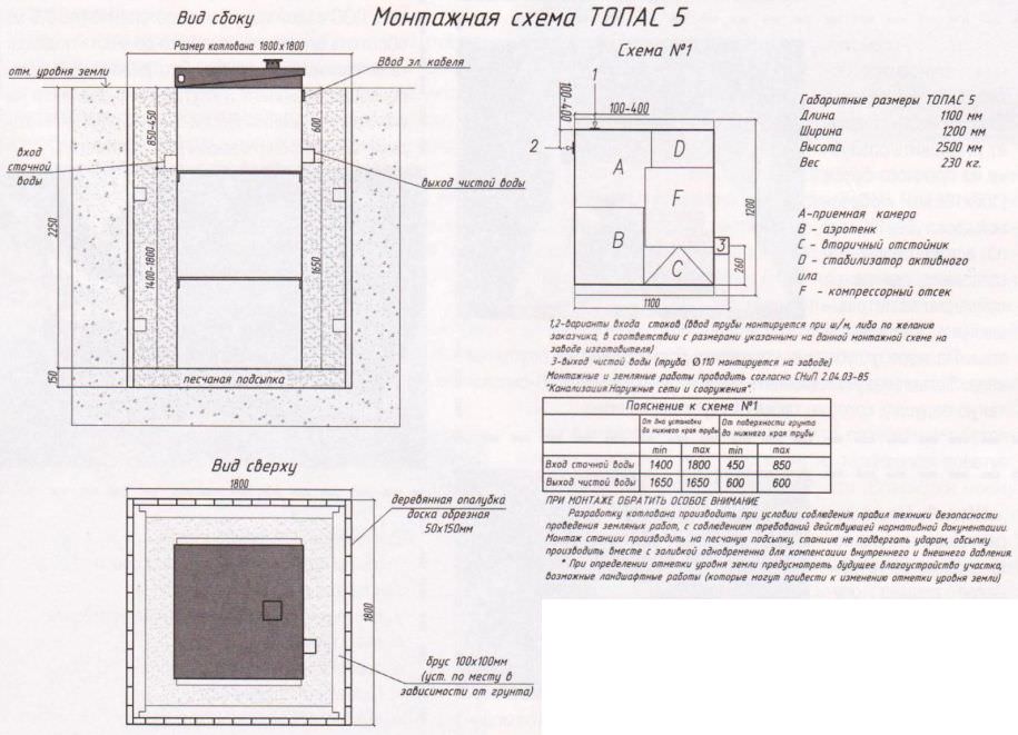 ЛОС «ТОПАС». Изготовлен из полипропилена. Суть работы системы - аэробная очистка с технологическими паузами, во время которых происходит эффективное удаление нитратов и нитритов, получаемых при разложении соединений аммонийного азота. Модельный ряд установок «ТОПАС» разнообразен и имеет многочисленные модификации. Срок эксплуатации любой модели - не менее 30 лет. Рассмотрим монтаж очистного сооружения «ТОПАС-5» - самого небольшого по габаритам из предложенного модельного ряда рассчитанного на постоянное пользование семьёй из 4-5 человек.