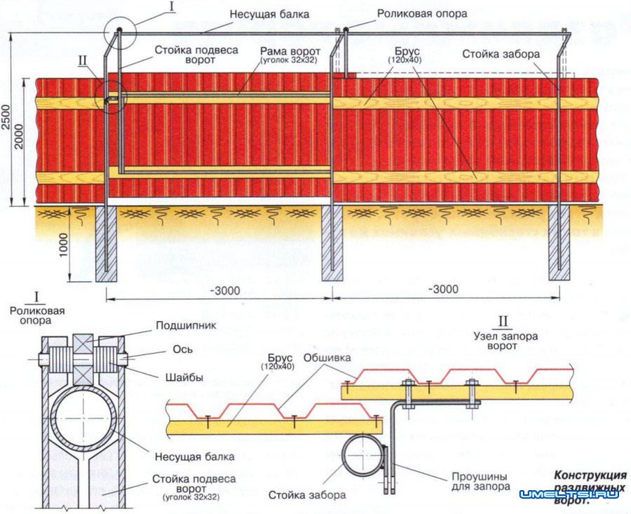Первое, с чего я советую начать, — определить ширину проёма раздвижных ворот. Обычно строители при сооружении ограждения из металла (забора) выбирают шаг столбов (расстояние между опорами) в 3,0 м. Поэтому и проём ворот целесообразно сделать шириной 3,0 м.