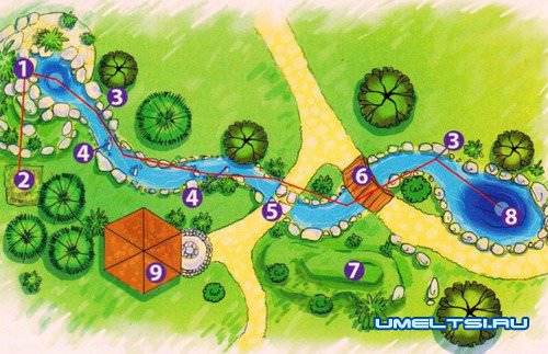 Создание ручья на участке начинают с проектирования русла на бумаге, поскольку, кроме декоративной составляющей, искусственный ручей замкнутого цикла требует правильного технического оснащения. Если участок имеет хотя бы небольшой уклон, вполне естественно, чтобы ручей стекал вниз с самой верхней его точки. Если такого уклона нет, его создают искусственно, располагая исток на вершине или склоне горки в виде родника или «плачущего камня» либо на подпорной стенке или просто стене в виде кувшина, скульптуры или «грота» из камней.