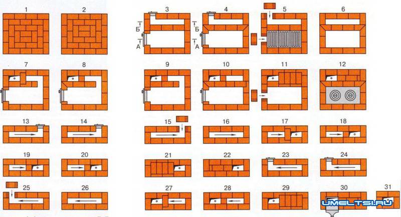 6-й ряд выкладываем по приведённой на порядовке схеме, а в следующем, 7-м, устанавливаем и фиксируем топочную дверку (250x280 мм). Обычно для крепления я использую очищенные от обмазки сварочные электроды диаметром 2,5 мм. В рамке дверки есть специальные монтажные отверстия, в которые я вставляю один конец проволочного анкера и загибаю его крючком, а второй — буквой Г и забиваю в подходящий соседний шов в кладке.