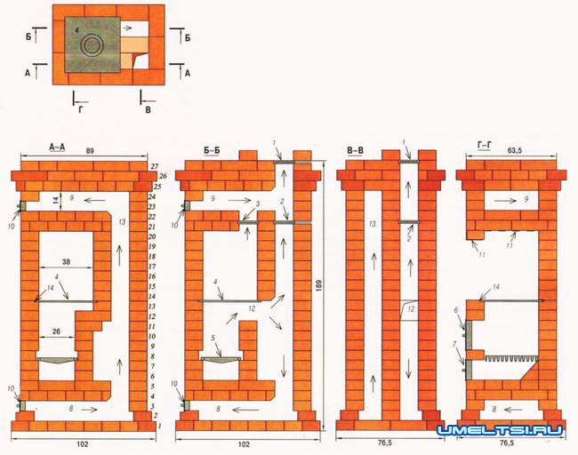 Первые два ряда печки кладут с небольшими выступами. Это делает внешний вид более интересным. 1-й ряд выкладывают сплошняком, а на 2-м начинают нижние дымоходы, которые перекрывают двумя рядами кирпича (на 4-м и 5-м рядах). В рядах 6-м и 7-м формируют поддувало, выше которого — на 8-м ряду — устанавливают колосниковую решётку.