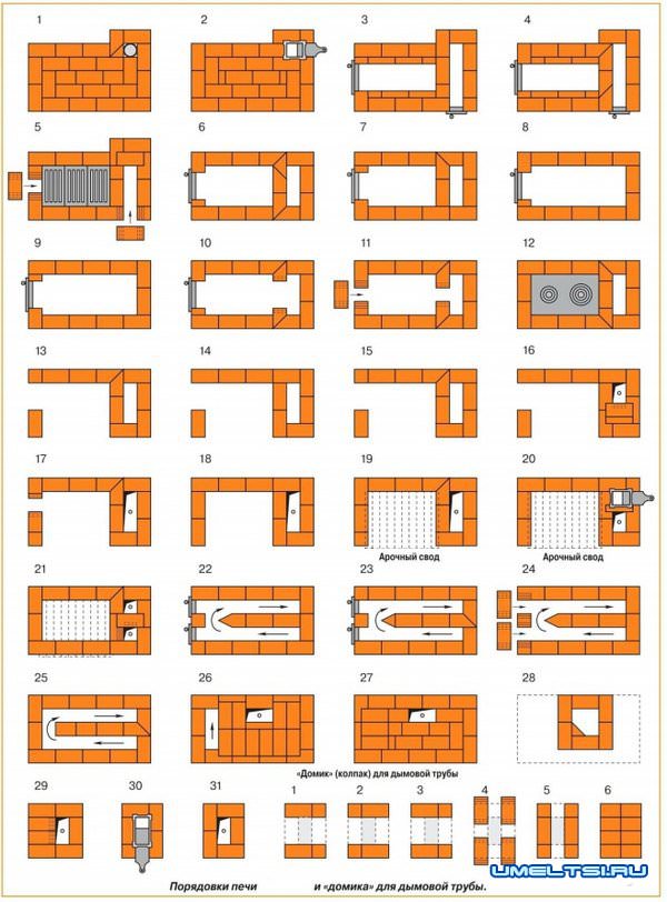 Варочную печь выкладываем в соответствии с порядовками. Никаких особых хитростей в отдельных рядах нет. После монтажа варочной плиты над ней возводим открытую с двух сторон варочную камеру. В отличие от печей-шведок, которые я сооружал раньше, здесь перекрытие над варочной камерой решил сделать в виде арочного свода, без поддерживающих уголков или какого-либо другого металла.