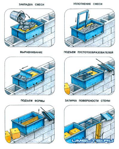 Увеличить теплосберегающие свойства стены примерно на 30% можно, применив в качестве формуемой смеси керамзитобетон, шлакобетон или опилкобетон, правда, и на столько же увеличится трудоемкость проводимых работ. К тому же, бетонные смеси на пористых заполнителях обладают меньшей прочностью и морозостойкостью. Внешне их необходимо защитить наружной отделкой. Также стена станет теплее, в случае когда вертикальные колодцы стен наполнить утеплителем.
