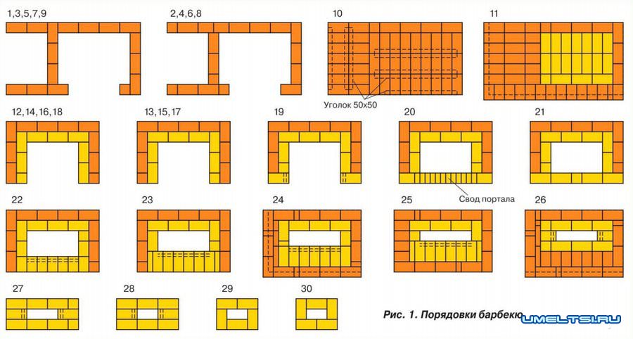 С 1-го по 9-й ряды ведётся кладка основания барбекю с нишами для дров и каминной утвари.
