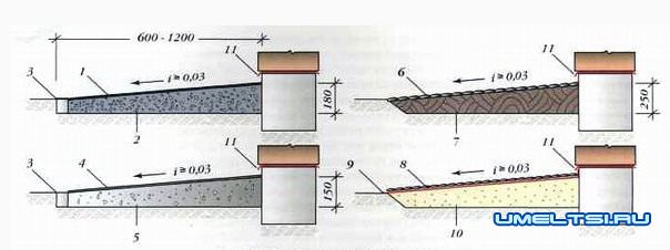 1 — асфальт толщиной 30 мм; 2 — щебень; 3 — бортовой камень; 4 — железнение (посыпка сырого бетонного основания сухим цементом с последующей затиркой); 5 — бетон м100; 6 — булыжный камень; 7 — жирная глина; 8 — дренирующий слой (булыжник, щебень, галька, крупнозернистый песок и т. п.); 9 — полиэтиленовая пленка; 10 — песчаный подстилающий слой или выровненный грунт; 11 — горизонтальная гидроизоляция