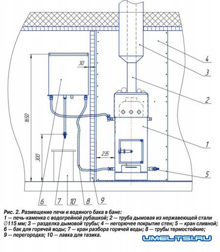 Собранную печь устанавливаем в парной комнате бани и через термостойкие шланги соединяется с навесным резервуаром для горячей воды либо с напольным баком.