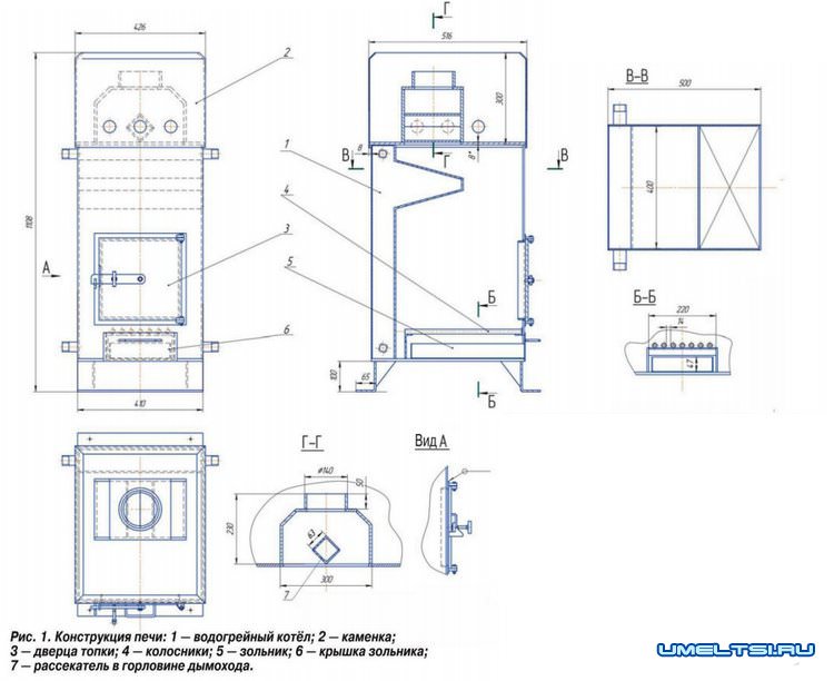 Запланированая мною модульная конструкция печки выполнена из топки которая закрывается дверцей, чугунные колосники и емкость для золы. (рис. 1). Вокруг котла создана водная рубашка. Его высота сформировалась от размера топки и дымохода. В верхней области котёл содержит выступ (фото 3), какой обдается горячими газами и необходим для них завихряющий поток зубом.