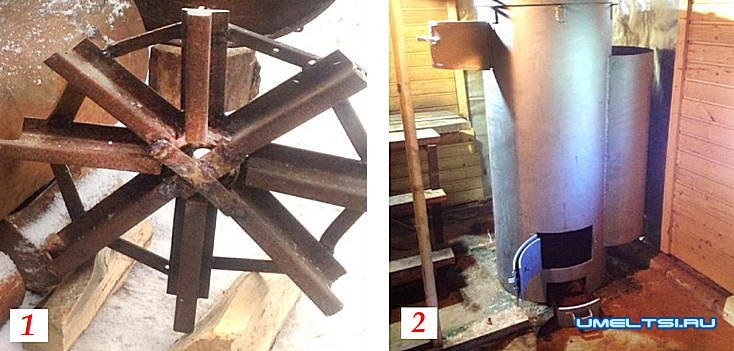 Из узкоколейных рельс и металлической полосы сварил корзинку для каменки (фото 1). Взял металлическую толстостенную трубу d 10 см длиной 10 см и установил ее в центре ранее отрезанного второго кольца. К цилиндру (трубе) приварил предварительно обрезанные в нужный размер восемь лучей-рельс. Кольцо служит как оправа (к нему ничего не приваривал)— основание получается круглой формы.
