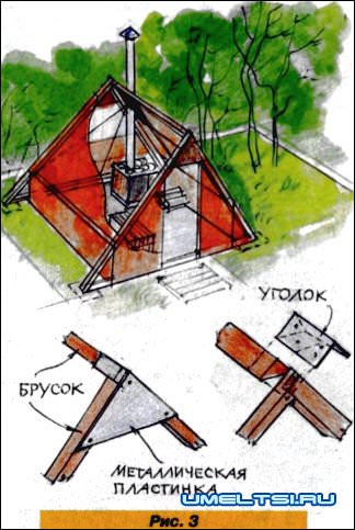 Основа конструкции - два треугольника из деревянных брусков, соединенных между собой горизонтальными брусками. Крепление деревянных элементов производится с помощью металлических уголков и пластинок (рис. 3). Покрытие такой мини-бани состоит из плотной цветной ткани. Пол - щит из деревянных реек. Окно для освещения помещения прорезано в торцевой стенке, противоположной входу.