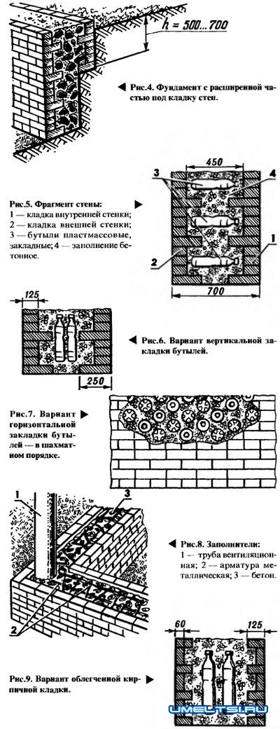 В процессе работы появлялись варианты закладки бутылок: вертикальное расположение (рис.6) и более плотное горизонтальное в шахматном порядке (рис.7). Практика показала, что предпочтительны бутылки с завинчивающимися пробками; если пробки отсутствуют, то бутылки следует закладывать горлышками вниз, вжимая в раствор для герметичности, иначе под тяжестью бетона они теряют свою форму, сплющиваются, и пропадает смысл их использования.