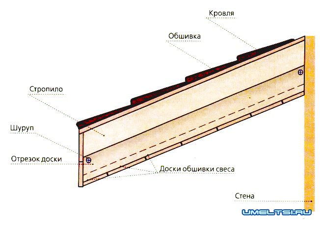 Чтобы обшивка смотрелась презентабельно, низ стропил должен представлять собой ровную плоскость. Если добиться этого не удается, к боковой поверхности стропил надо прикрепить на шурупах отрезки доски толщиной до 40 мм и шириной 100 мм. Длина доски должна соответствовать расстоянию от конца свеса кровли до стены. Сначала прикручивают первый отрезок с одного края свеса, затем еще один с противоположного, после чего натягивают веревку, по которой выставляют и прибивают к стропилам остальные отрезки доски. К выровненной таким образом плоскости можно крепить обшивку. Крепления следует выполнять с помощью шурупов или металлических уголков. На них не стоит экономить.