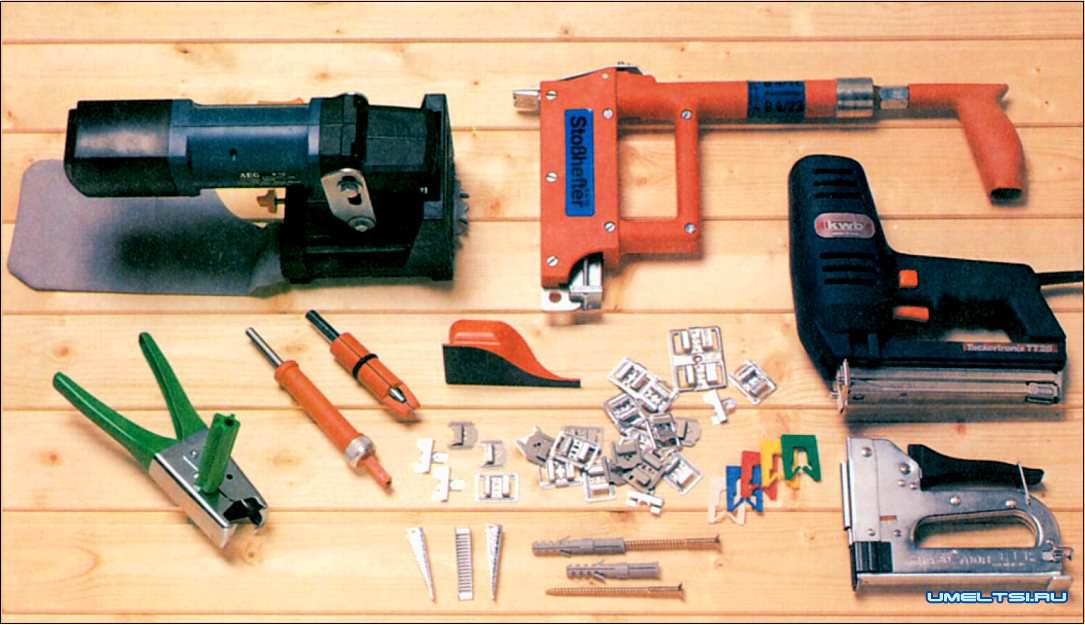 Вверху слева — фрезерная машинка или насадка на угловую шлифмашинку для выборки пазов под плоские шпонки. Справа — устройство для прихватывания досок на стыках, ручной степлер, электрический степлер. В среднем ряду (слева направо) — панельные клещи-зажимы, гвозде держатели, устройство для подшлифовки кромок досок, кляммеры для крепления досок. Внизу — приспособления для юстировки (выверки) реек обрешётки относительно стены.