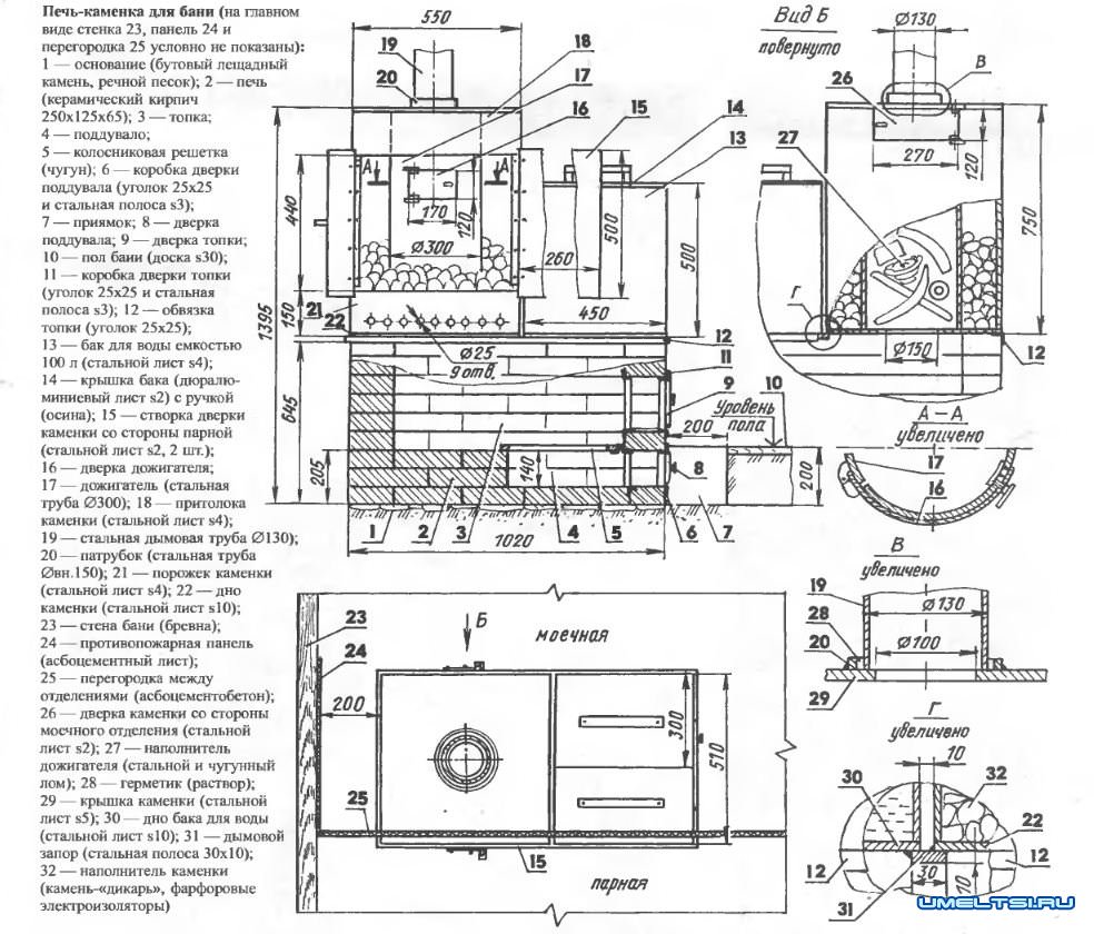 В плане (территориально) печка расположена в моечном отделении и только один ее бок с распашными дверками каменки через несгораемую асбоцемент-нобетонную перегородку выведен в парную. Кроме того, между печью и стеной бани оставлен промежуток (отступка). Стена в этом месте обшита асбоцементным листом.