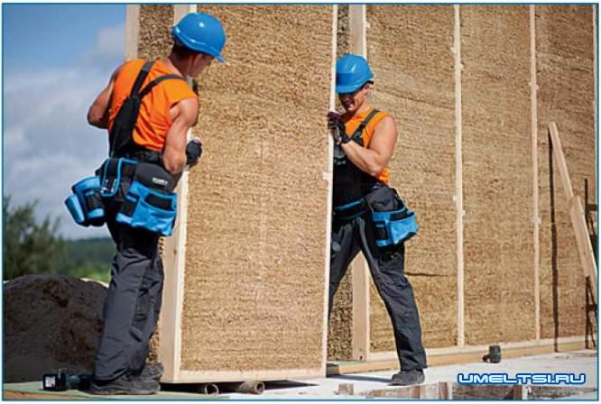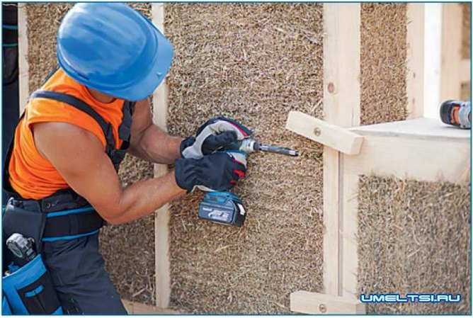 Вес соломенных блоков небольшой — их можно монтировать вручную.