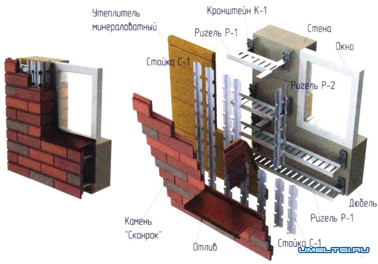 Облицовка из искусственного камня внешне имитирует традиционную кирпичную кладку с характерной вертикальной и горизонтальной расшивкой