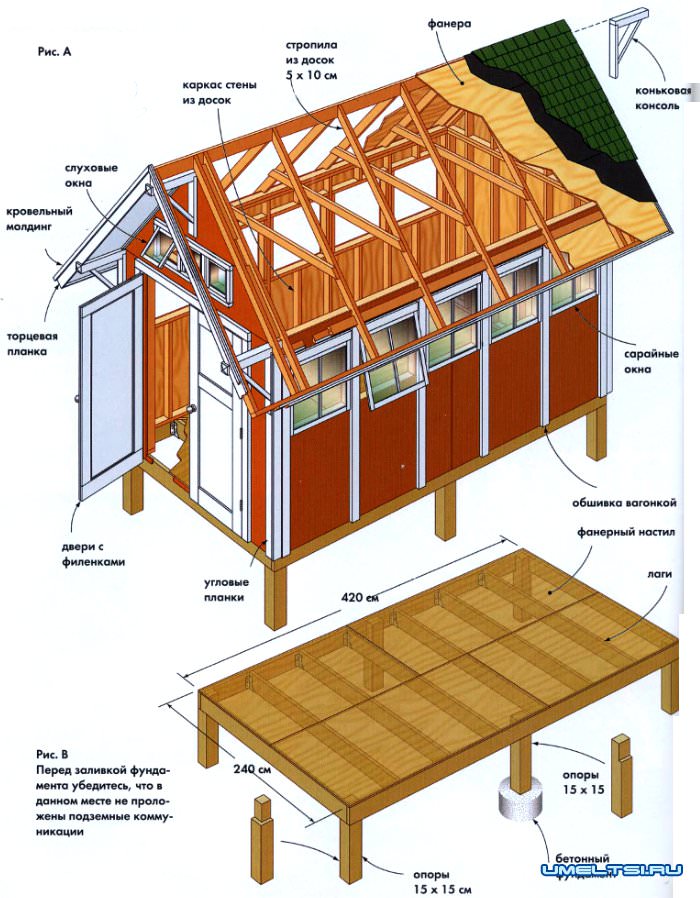 Разместите раму на том месте, где вы планируете поставить сарай, и разметьте места под шесть опор. Залейте в ямы слой бетона 20 см, оставьте его застывать на сутки. На следующий день выпилите опоры и сделайте в верхней части врубки (рис. В), чтобы образовался гребень. Закрепите раму на опорах, заворачивая шурупы под углом. Убедитесь в том, что опоры строго вертикальны. Установите опоры на бетон, утрамбуйте вокруг землю. Закрепите лаги и настелите пол из фанеры.