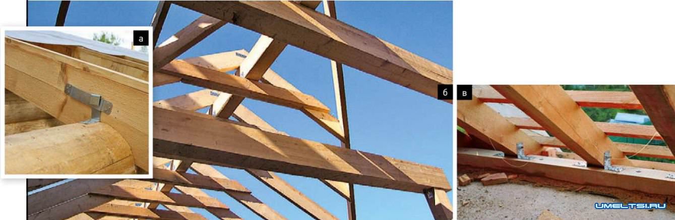 Возведение крыши над деревянным или каменным домом начинается с монтажа стропильной системы. Однако в деревянном здании стропила должны подвижно крепиться к мауэрлату (а) и над коньковым прогоном между собой (6). В каменном — неподвижно (в)