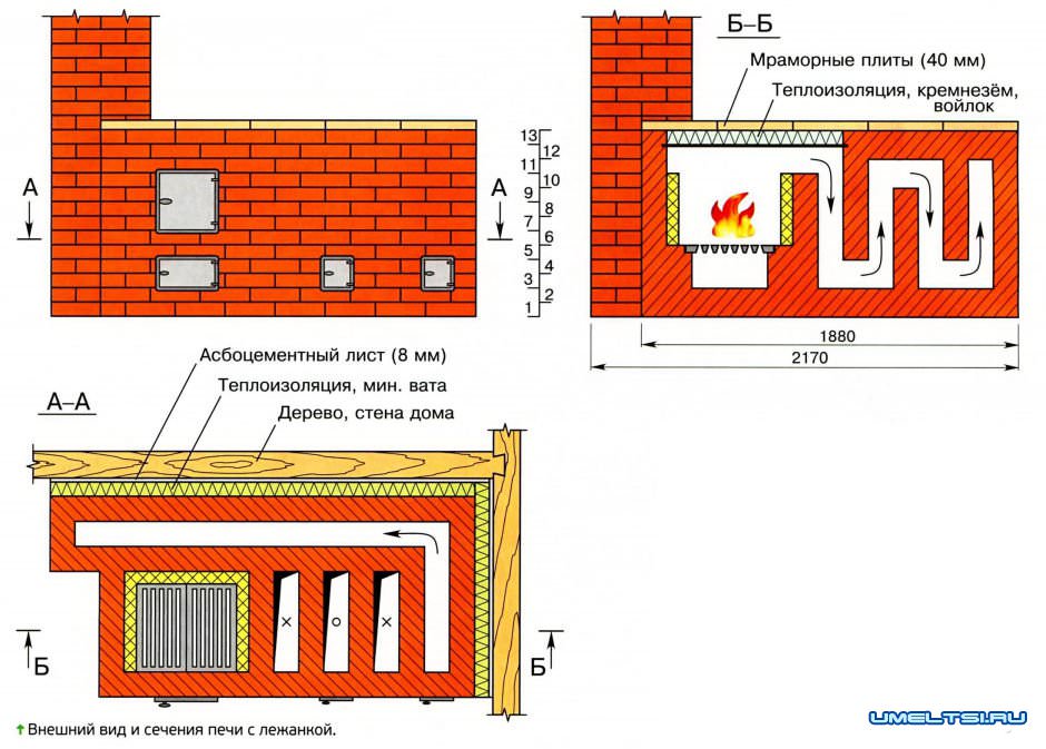 Надо было сделать новую печь, у которой тоже имелась бы лежанка, только расположенная ниже, чем в старом варианте. Однако устроить лежак нужной площади ниже уровня варочной плиты нам вряд ли удалось бы. Мы могли сделать его на высоте в 13 рядов кирпича, а преодолеть две ступени, чтобы подняться на такой подиум, вполне возможно даже в преклонном возрасте.