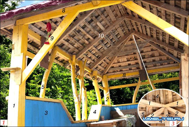 На опорные столбы уложил балки из бруса 5x5 см (8). Со стороны входа дополнительно усилил их распорками (9) Поставил на длинных балках стропила (10). Поскольку крыша четырехскатная, присоединил к ним (фото 3, п. 1) со стороны торцов беседки по две угловые стропилы (2), а к ним — торцевую (3).