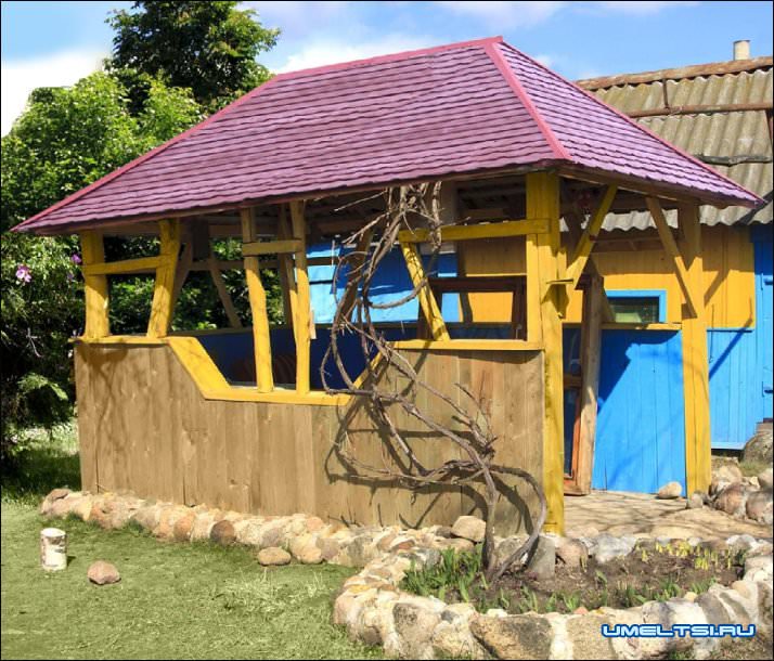 Какой же отдых на даче без беседки? Здесь и чаю попить можно, и от дождя укрыться да и для большой семьи хватит места. Свою беседку я сконструировал из дерева в оригинальном стиле.