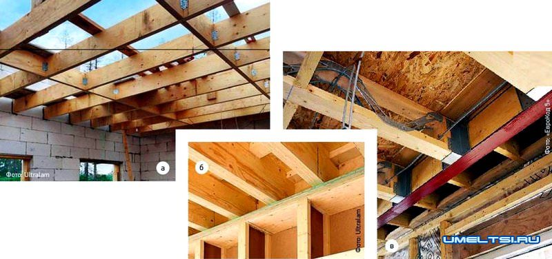 Перекрытия из LVL-балок (а, 6) и деревометаллических ферм (в) способны выдержать распределённую нагрузку до 900 кгс/м2. Самые прочные на изгиб балки — из LVL-бруса