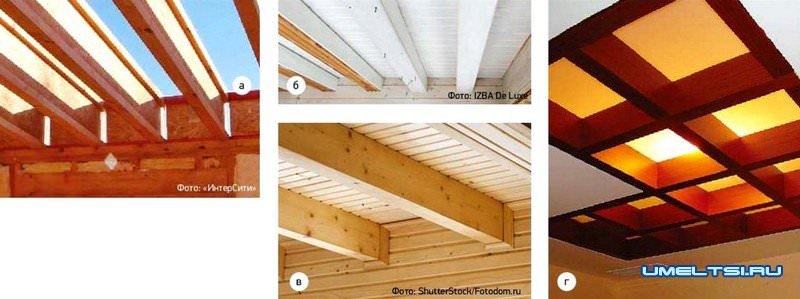 Балки из двутавра и обычного бруса можно обшить вагонкой (а, б). Строганые изделия (в) шлифуют и покрывают лаком. При достаточной высоте помещения иногда монтируют декоративные кессонные потолки (г)