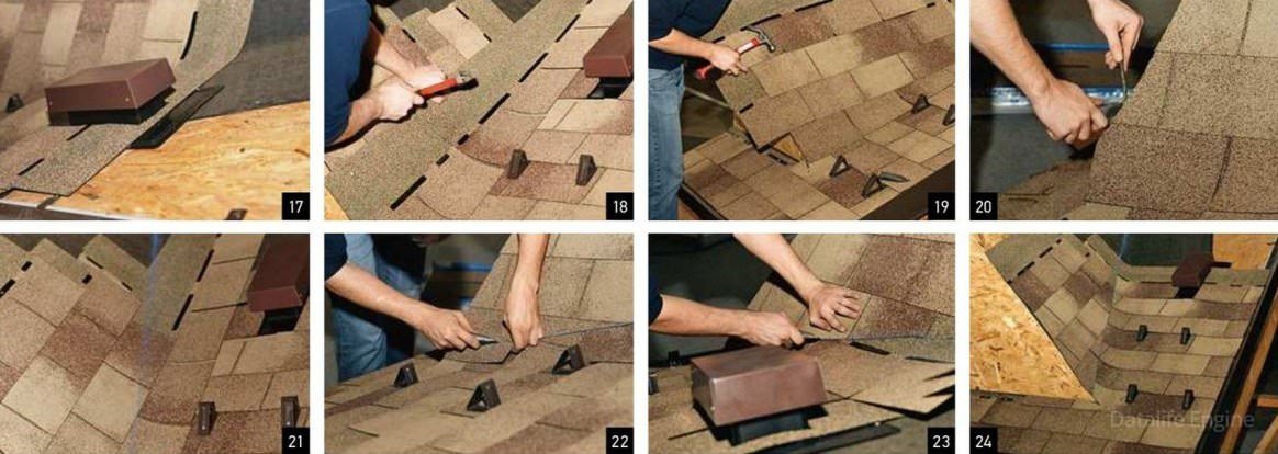18, 19. Затем приступают к монтажу гибкой битумной черепицы в ендове. Её укладывают способом «подрез». Сначала монтируют гонты на скате, имеющем меньший уклон и протяжённость, — элементы каждого ряда заводят через ось ендовы на другой скат. Далее укладывают гонты на соседнем скате. Обратите внимание: в зоне ендовы материал фиксируют только с помощью строительного фена либо битумной мастики. Нельзя прибивать черепицу гвоздями, располагая их ближе 30 см к оси ендовы с каждой строны. 20. Части гонтов, выступающие за пределы ската, обрезают. 21-24. Потом приступают к подрезке черепицы, уложенной со стороны ската с большим уклоном. Для того чтобы повысить прочность покрытия, подрез выполняют, отступив от оси ендовы на 5-10 см. Линию реза предварительно прочерчивают с помощью специального карандаша.
