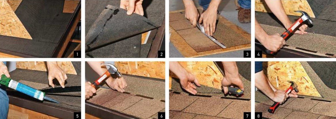 1, 2. Для дополнительной гидроизоляции крыши на сплошное основание из ОСП-3 укладывают рулонный битумный подкладочный ковёр. Его раскатывают только вдоль карнизного свеса, оси ендовы и торца крыши и фиксируют оцинкованными гвоздями и битумной мастикой. На сплошной настил по свесу и торцу устанавливают металлический фартук. Впоследствии места соединения кровли с фартуком обрабатывают битумной мастикой. 3. При укладке черепицы Tegola все части покрытия выполняют из рядовых гонтов, без использования доборных элементов. А пластинки начального ряда (на карнизном свесе) обрезают вдоль линии паза острым ножом с крючкообразным лезвием и приступают к монтажу. 4, 5. На карнизном свесе гонты фиксируют оцинкованными гвоздями и битумной мастикой. 6. Черепицу крепят вдоль линии паза. 7, 8.