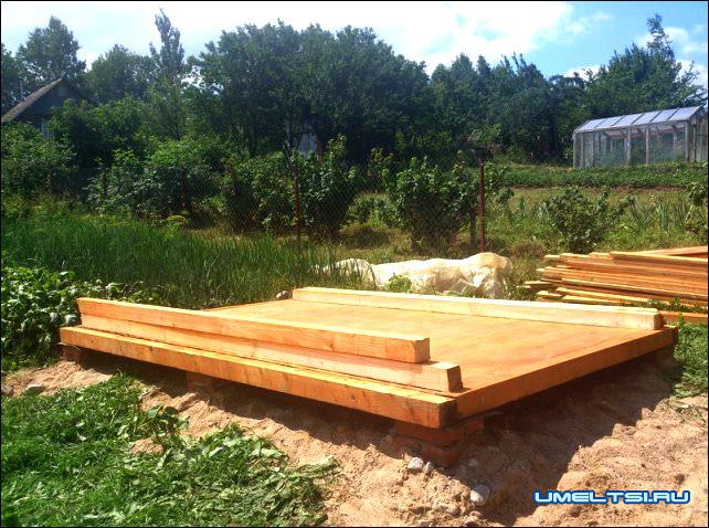 Делаем нижний ярус беседки, используя деревянные брусья. Из них же делаем и доски для пола.