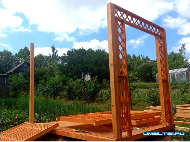 Монтируем из щитов стены нашей самодельной беседки. Собирая их в единое целое.