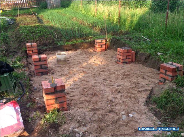 Сваи засыпаем песком, хорошенько все разравнивая и утрамбовывая, и так почти до конца высоты кирпича, оставляя один верхний слой в два кирпича.