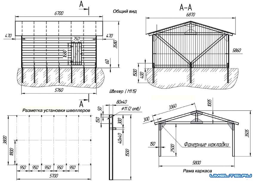 Начертил каркас основания для кровли и разметку установки швеллеров (см. рис.).