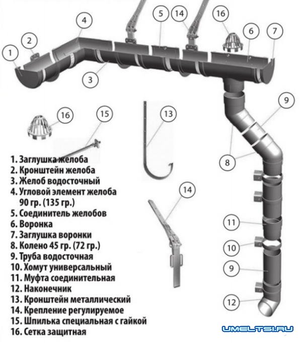 В среднем на каждые 10 м длины скатов устанавливается по водосборной воронке. Очевидно, сколько воронок, столько и водосточных труб, длина которых равна расстоянию от уровня земли до кровли. Количество колен (изгибов) определяется особенностями фасада.