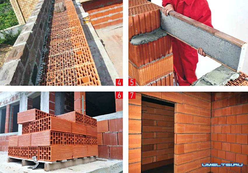 Особого внимания заслуживает кладка дверных и оконных проёмов. Для удобства необходимо использовать специальные доборные элементы. Например, блоки с размерами 380 x 125 x 219 мм, которые служат для удобства создания перевязки именно на дверных и оконных вертикальных откосах при ведении кладочных работ (фото 5, 6).